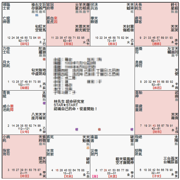 因此我們從以上的特質就能了解命主本身是一位負責又拼命的母親,所以當年紀越大的時候,就會反應一些跡象在身體上,來分析一下第六大限這十年的運勢極需要注意的事。