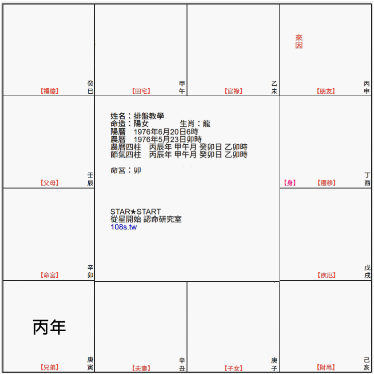 ☆範例:命主出生年為1976年(丙辰年),因一月的天干為「庚」,地支在「寅」。