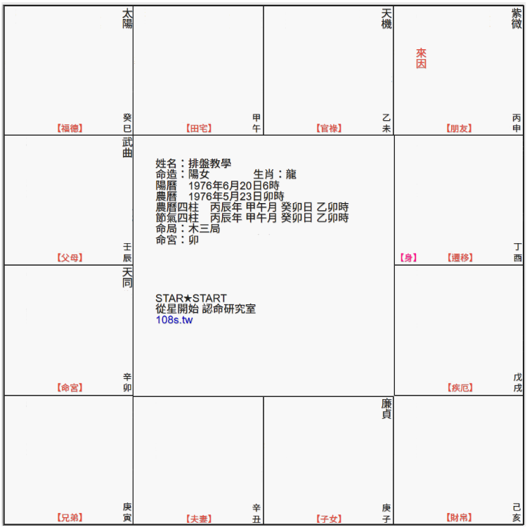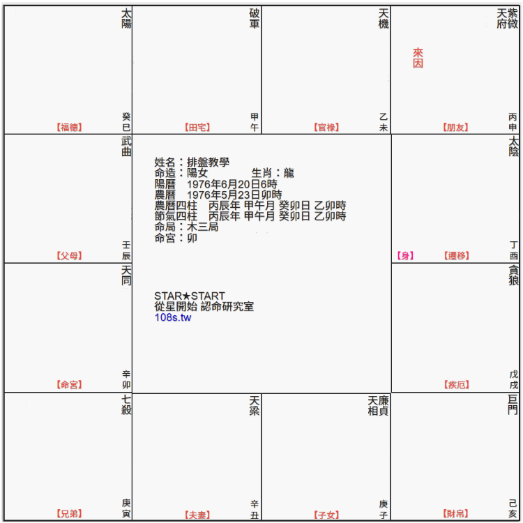 ☆範例:命主是農曆:1976年05月23日,木三局,因此紫微星是安在「申位」。