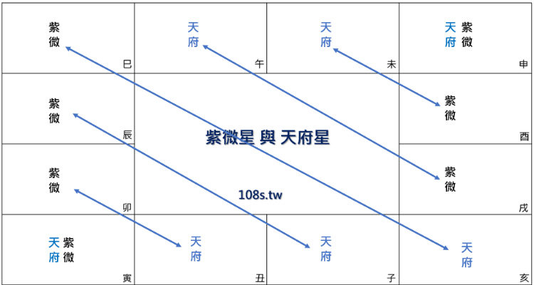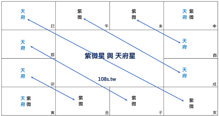 在紫微星在午位時,天府在戌位;紫微星在戌位時,天府在午位。