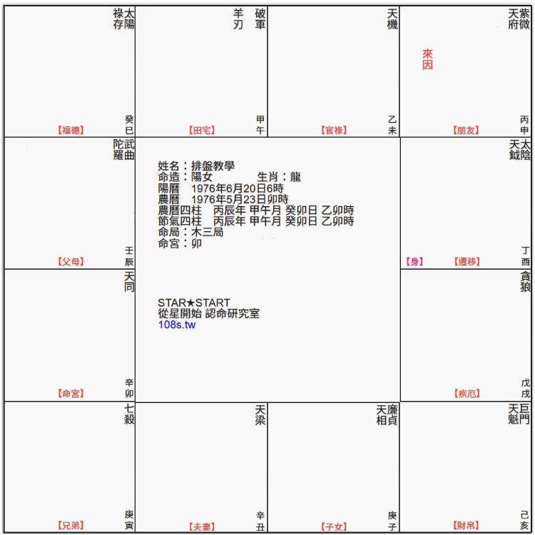 ☆範例:命主出生年為西元1976年,尾數6為丙,因此祿存在巳位,擎羊(羊刃)在此午位,陀羅在辰位,天魁在亥位,天鉞在酉位。