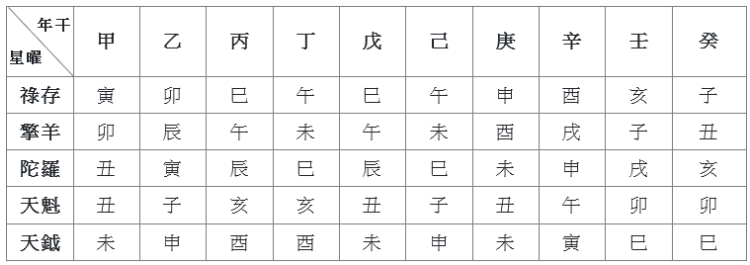 ★屬於年干的星曜有祿存、陀羅、擎羊(羊刃)、天魁、天鉞,對照表如下: