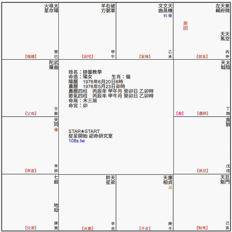 ☆範例:命主出生年為1976年為丙辰年,丙年四化為:天同化祿、天機化權、文昌化科、廉貞化忌。