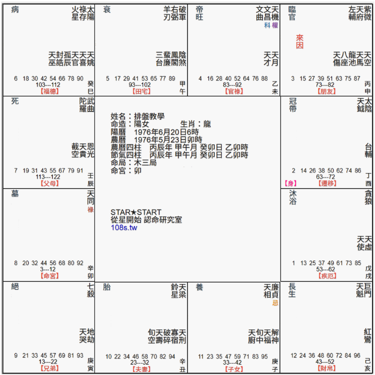 ☆範例:命主出生年為西元1976年,丙辰年,木三局長生在亥,因此長生定位在亥位,而出生地支辰為奇數,因此為陽女逆行排列出長生十二星。